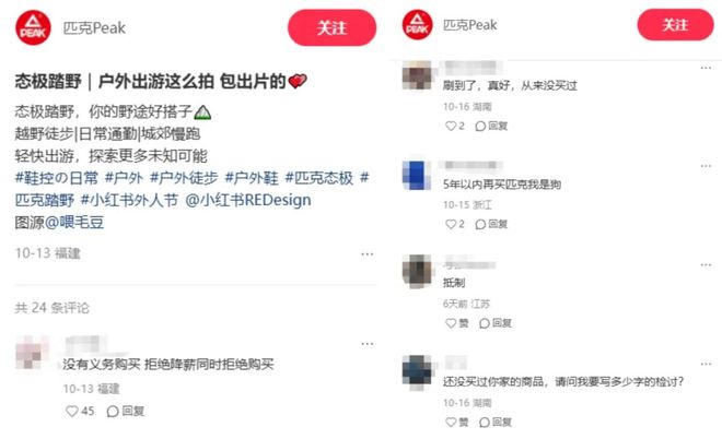 近日,在运动品牌匹克官方社媒账号的评论区,你能看到不少类似的评论。