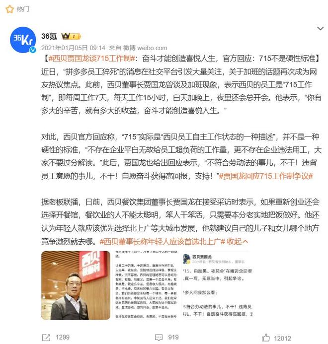 西贝董事长曾经关于加班的言论。(图/社交媒体截图)