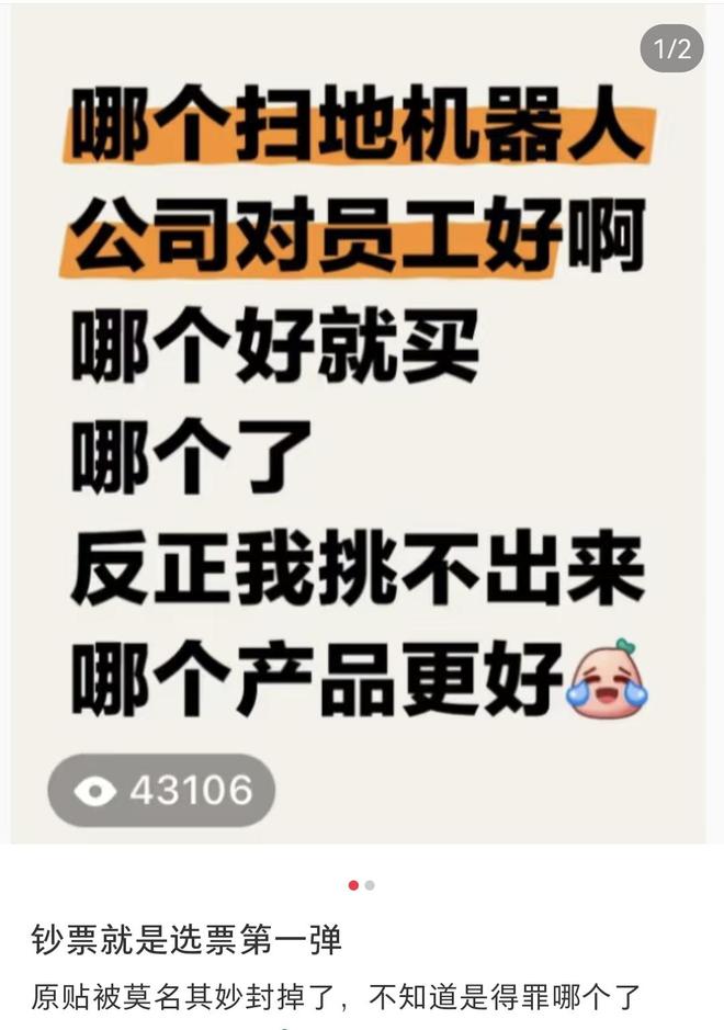 最近,有位网友发帖表示,她打算买一个扫地机器人,但觉得市面上的品牌在技术、性价比、服务方面差距不大,于是想问问在这些企业工作的员工体验如何。她决定,哪家企业对员工好,就买哪家的扫地机器人。此举引来了不少企业的员工现身说法。