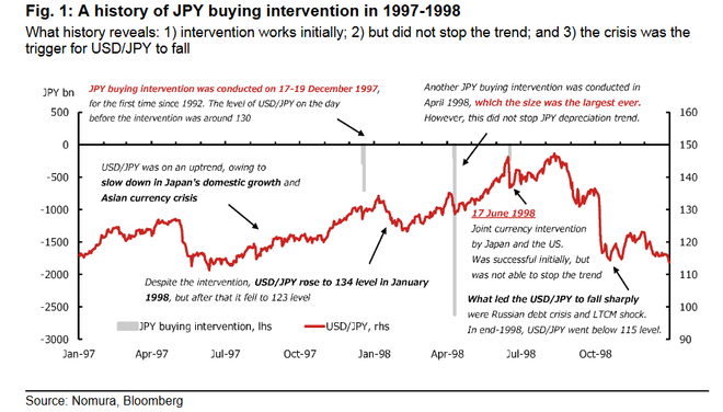 野村证券的报告回顾了1997-1998年的情况,当时日本财务省进行了多次日元买入干预,其中还包括与美国的联合干预。但历史表明,这些干预措施并未能完全阻止日元的贬值趋势。