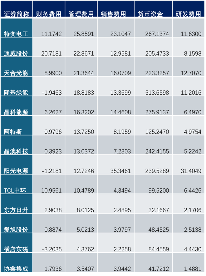 补充说明一点,研发费用不属于三费,赶碳号统计数据时特别加了进来了,意外发现:天合光能的研发费用是最高的。特变电工的研发费用,大部分不是光伏,阳光电源则属于逆变器行业。