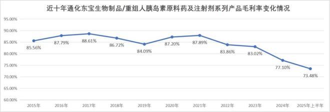 随着集采的深入,不论是二代还是三代胰岛素,都已经只能陷入低利润厮杀之中。自2015年以来,通化东宝生物制品/重组人胰岛素原料药及注射剂系列产品毛利率已经从最高87.89%一路下跌至今年上半年的73.48%。