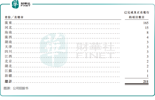 同时,公司业务呈现明显区域集中特征,在211个已完成及正在进行的项目中,有近80%(165个)来自广东省。