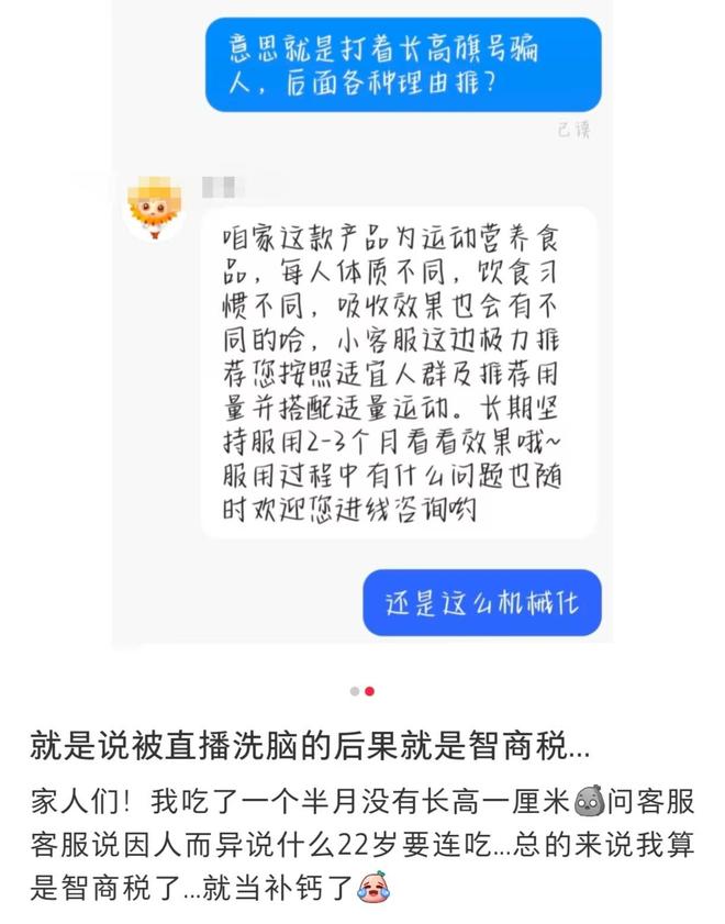 这些宣传虽很隐晦,但有了小葵花品牌的背书、平台的大力宣传,仍在消费者心中种下了“长高神药”的种子。不少有身高焦虑的网友在社交平台晒使用体验,均是以能不能长高作为评价标准。多名消费者反馈产品“不管用”,有网友直言“吃了一个半月没有长高一厘米……总的来说我算是智商税了”,还有人反映“打卡60天没有任何效果,服用期间出现了短期的膝盖隐隐作痛的情况”。