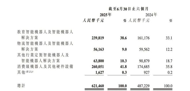 8月29日,"人形机器人第一股"优必选公布了2025年上半年的财报,营收6.21亿元,同比增长27.5%;亏损4.40亿元,同比减亏18.5%;毛利2.17亿元,同比增长17.3%。优必选半年报里,教育智能机器人及解决方案收入2.4亿元,同比增长48.8%,占营收的比例为38.6%(比2024年同期增加5.5%)。
