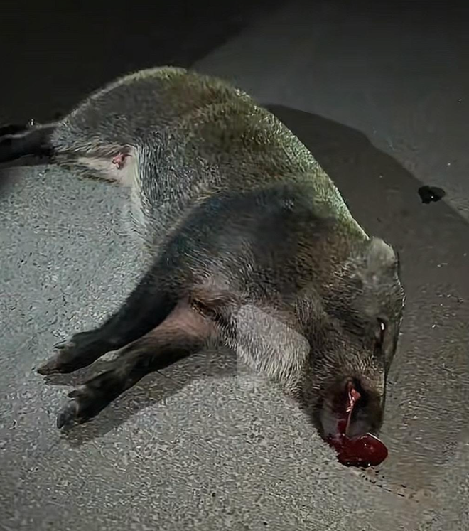 杨先生向记者回忆,11月2日晚7点半左右,他载着5岁的女儿,驾车从安徽六安市舒城县去往合肥。车辆行至舒城县万佛湖附近国道时,突然有三头野猪横穿马路。尽管他发现时立刻踩下刹车,但因躲避不及,车辆仍撞上其中最大的一头野猪,并致其当场死亡。
