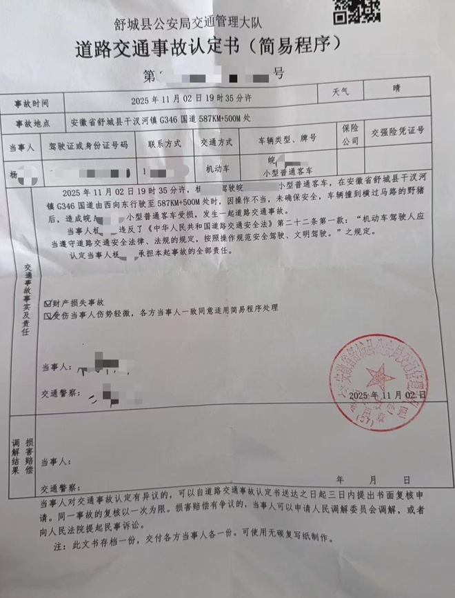 撞到野猪后,杨先生迅速报警。他提供的舒城县公安局交通管理大队出具的《道路交通事故认定书》(下称《认定书》)显示:事故发生于11月2日19时35分许,杨先生驾车行驶在舒城县干汊河镇G346国道由西向东行驶至587KM+500M处时,因操作不当,未确保安全,车辆撞到横过马路的野猪后造成汽车受损,发生道路交通事故。