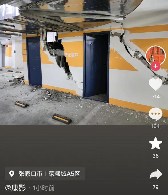 近日,有多位网友发视频反映,张家口市万全区荣盛城A5区地下车库地面、墙面出现多处裂痕,部分照片显示墙面有破洞等情况,他们担忧安全问题。