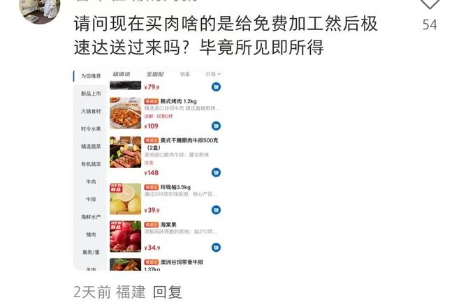 还有人无奈调侃 “现在买肉是免费加工后极速达吗?毕竟所见即所得”。