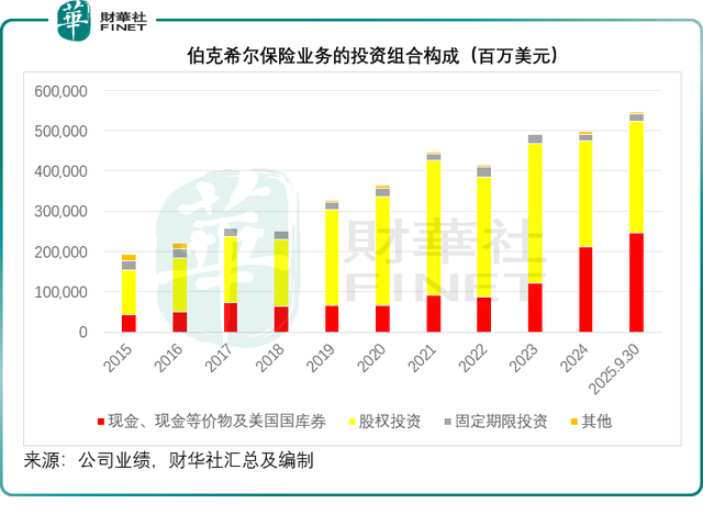 其投资主要依赖于巴菲特优秀的"选股"技能,因此不同于其他保险公司的投资组合以固定收益证券为主——以平衡其保险业务的现金流久期,伯克希尔的投资组合倾向于风险较高的股权投资。