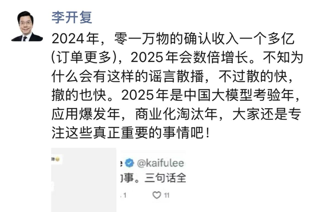 李开复在回应传闻时也试图展示信心:"2024年,零一万物的确认收入一个多亿(订单更多),2025年会数倍增长。"但显然,这样的收入规模难以支撑大模型的训练成本。