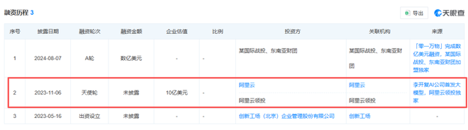 天眼查显示,零一万物成立于2023年5月16日,半年后便获得阿里云领投天使轮,投后估值为10亿美元。