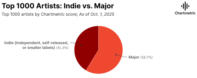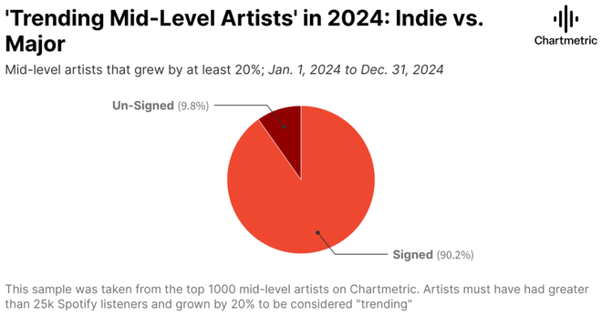 比如,Chartmetric数据显示,在排名中腰部区间(12k–35k)且在2024年实现了至少20%增长的艺术家中,超过90%都是独立音乐人,而来自大厂牌的只占不到10%。