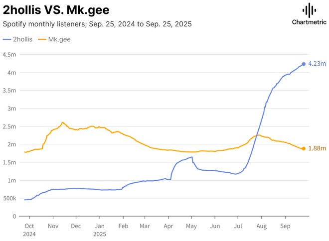 有意思的是,从数据上看,2hollis的增长速度显然更快。如图所示,在2024年,2hollis的月度听众仅50万,明显低于Mk.gee的170万左右。然而,到了2025年9月,2hollis的月度听众数大幅增长,突破423万,尽管没有行业背书,他的表现依然远远超过了Mk.gee。
