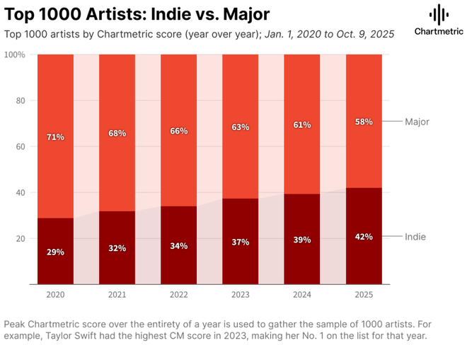 如今独立音乐与主流音乐的份额已逐渐趋近,生态格局也随之发生转向。艺术家在签下合约之前,就能先以"小型媒体组织"的姿态完成自我启动,创作、发布、传播、社群经营一体化运作。