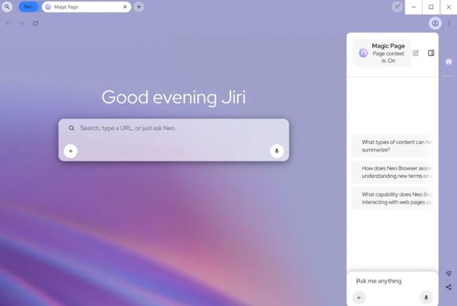 这就好像有一个“超级助手”坐在你身边,几乎与你一起浏览。它会帮你记忆内容,帮你提取信息。如果需要的话,它甚至能帮你访问50个不同的网站,并进行总结。所以我把它称为一个“个性化的、主动的智能体”,就像一个超级助手陪在你身边,这就是Neo浏览器正在努力实现的价值。