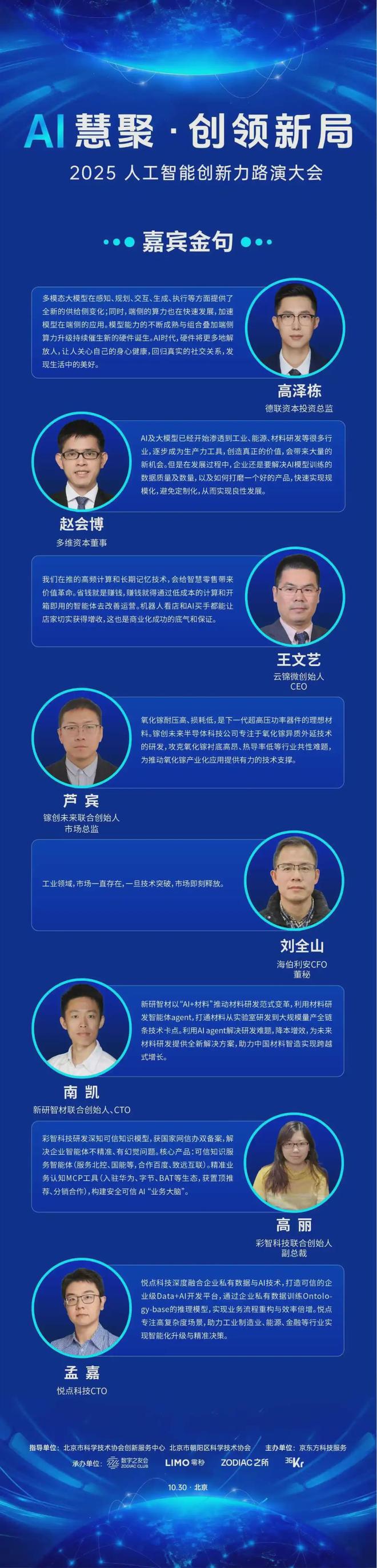 在此背景下,由京东方科技服务主办,数字之友会、LIMO零秒、ZODIAC之所、36氪共同承办的“AI慧聚·创领新局”2025人工智能创新力路演大会在北京圆满落幕。本次活动为落实赋能园区科协高质量发展项目要求,在北京市科学技术协会创新服务中心、北京市朝阳区科学技术协会的指导下,汇聚了来自AI、工业智能、新材料等领域的创新企业、投资机构与行业专家,共同打造了一场高价值的产业对接平台。