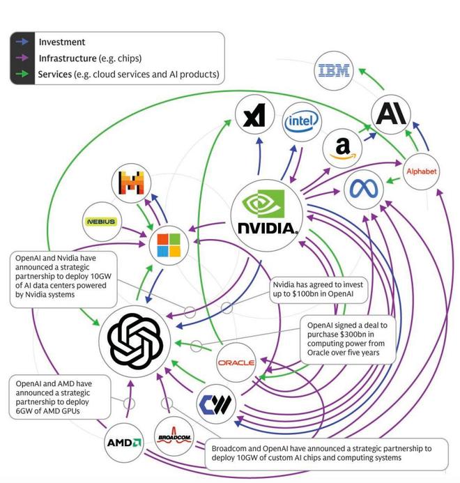 (3)从市场的证券化程度和资金结构看,AI债务融资的显著增加也带来一些风险警示。尤其是围绕OpenAI所展开的巨额供应商融资,与互联网泡沫时期电信供应商互购设备极为相似。