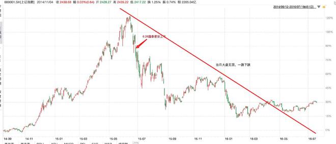 上市当月,大盘见顶5178点后一路下跌,到2016年初跌幅接近50%。同时,国泰君安在7月1日创下37.30元峰值后,此后始终没有突破当年高点。
