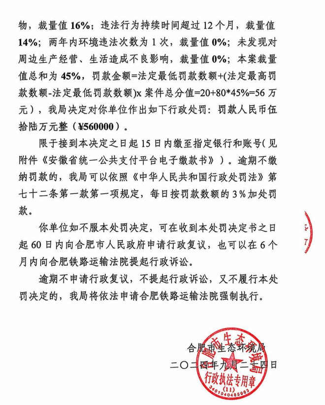 ▲安徽合肥市生态环境局行政处罚决定书