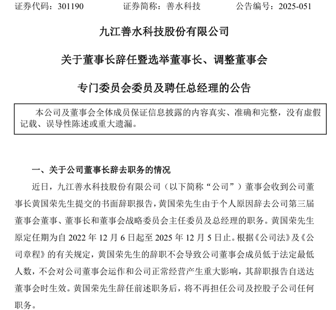 同时,公司公告称公司董事会收到公司董事长黄国荣先生提交的书面辞职报告,黄国荣由于个人原因辞去公司第三届董事会董事、董事长和董事会战略委员会主任委员及总经理的职务。黄国荣原定任期为自2022年12月6日起至2025年12月5日止。