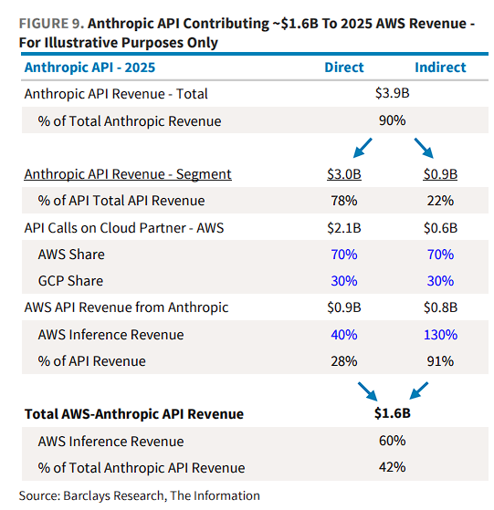 值得注意的是,巴克莱的分析基于Anthropic 70%的收入托管在AWS上的假设,其余30%在谷歌云平台(GCP)上。