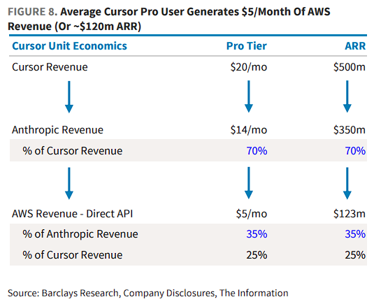 Cursor、Lovable等AI编程工具通过Anthropic的Direct API获得模型授权,按每百万token成本付费。巴克莱估计,平均每个Cursor Pro用户每月为AWS贡献约5美元收入