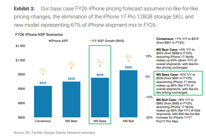 这一潜在的定价举措,是摩根士丹利看好苹果业绩前景的核心原因。该行预测,此举将推动苹果2026财年的iPhone平均售价(ASP)同比增长5%至939美元。相比之下,市场普遍预期仅为增长1%至910美元,暗示着苹果的营收和利润潜力可能被低估。