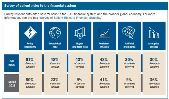 这份报告表明,市场面临的风险已从具体的贸易政策担忧转向更广泛的政策不确定性,同时人工智能(AI)相关资产的估值风险开始进入监管视野。