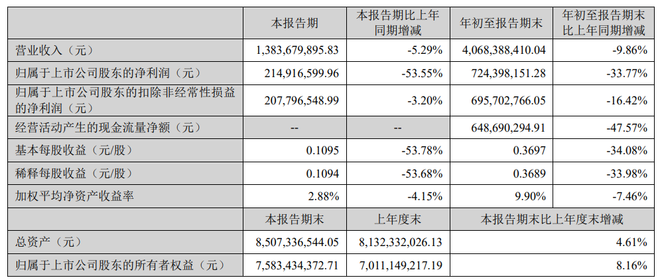 第三季度,公司营业收入为13.84亿元,同比下降5.29%;归母净利润为2.15亿元,同比下降53.55%;扣非归母净利润为2.08亿元,同比下降3.20%。