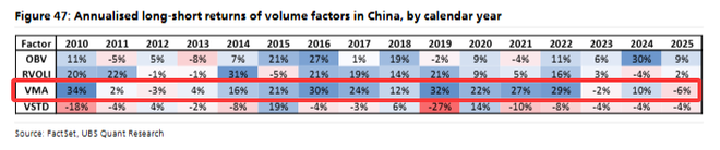 - 成交量类指标冠军:VMA (成交量加权移动平均)通过平滑成交量数据来计算,多年来VMA均实现了两位数的正收益,其中2010年收益高达34%,2016年为30%,2019年为29%。年化多空回报为16%。