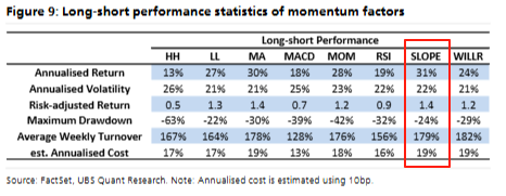 - 动量类指标冠军:SLOPE指标捕捉趋势的延续性,实现了31%的年化多空回报,风险调整后收益为1.4。