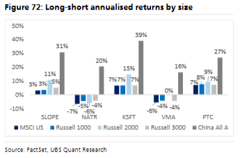 当瑞银量化分析师将中国市场的回测结果与美国市场进行基准比较时,差异极为明显。