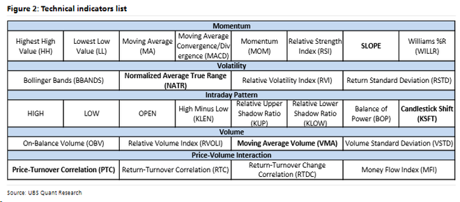 瑞银研究将技术指标分为五大类别:动量、波动率、日内模式、成交量和量价结合。每个类别中都出现了明确的领先者: