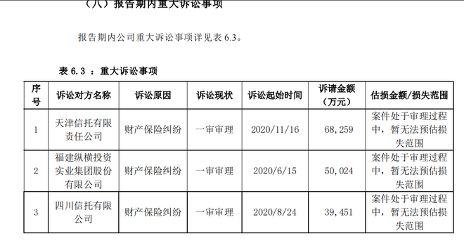 报告还披露了大地财险三起重大未决诉讼,均涉及财产保险纠纷,诉请金额合计超15.7亿元。其中与天津信托的纠纷涉案金额最高达6.8亿元,案件仍在审理中,损失暂无法预估。