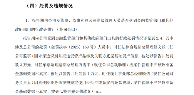 值得关注的是,三名现任高管因历史责任受罚:监事舒文跃(时任法律合规部总经理)因未穿透识别关联方资产信息被警告并罚款;总裁助理万雪平(时任理赔部总经理)因准备金数据不真实被警告并罚款7万元;财务负责人顾佶(时任线上事业部总经理)因条款费率使用违规及数据问题被警告并罚款8万元。