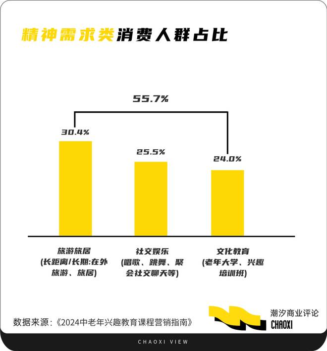 "张阿姨"们这股个体层面的微小浪花,正汇聚成银发经济中一股不可忽视的浪潮。据中老年产业服务平台AgeClub、教育行业媒体黑板洞察共同推出的《2024中老年兴趣教育课程营销指南》中显示,日常消费中,除必备的生活支出外,55.7%中老年人群每月在精神需求类的产品或服务方面有支出,其中24%会选择老年大学、兴趣培训等方式增加生命厚度。