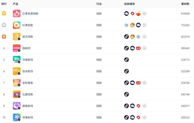 值得注意的是,9月榜单中位列第三的金枝看剧跌至10月榜单第七,素材量减少了17.1万组,环比下滑40.2%;9月榜单第八的蛋花短剧则升至10月榜单第三,素材量增加了9.4万组,环比上涨28.7%。