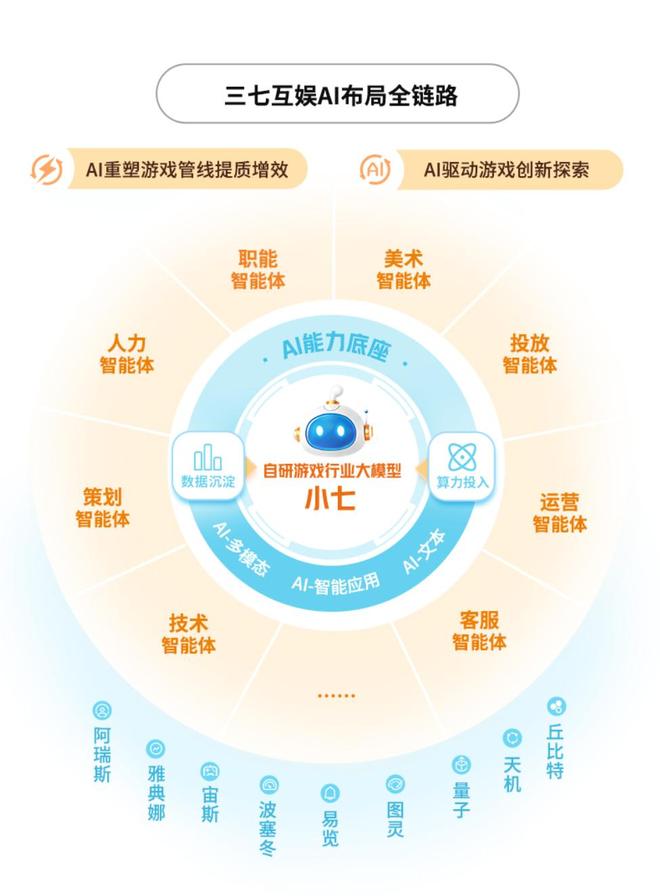 目前,第一个阶段就像现在入门AI一样,大家可以根据不同的需求选择AI工具,最终由人来决定一些关键的选择。第二个阶段就是AI可以完全颠覆产品以往的生产线,比如三七互娱基于AI能力底座、打造涵盖智能化产品层与业务应用层的AI架构,自主研发了游戏领域行业大模型「小七」,构建「小七」智能体平台,覆盖市场分析/产品立项/美术设计/开发辅助/广告投放/运营分析/智能客服/通用办公等各业务领域。