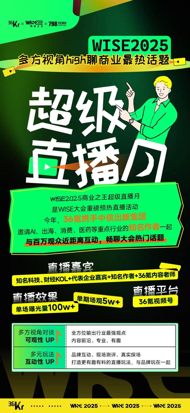 WISE超级直播月:大会还没开始,直播间先玩起来!我们联合中信出版集团,邀请各行业大咖和KOL,在36氪视频号上畅聊AI、出海等最热话题,保证前沿、专业又好玩!