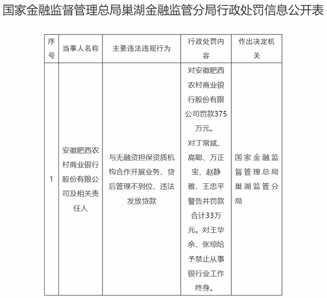 安徽肥西农商行因违法发放贷款遭罚375万元,两名责任人遭终身禁业!