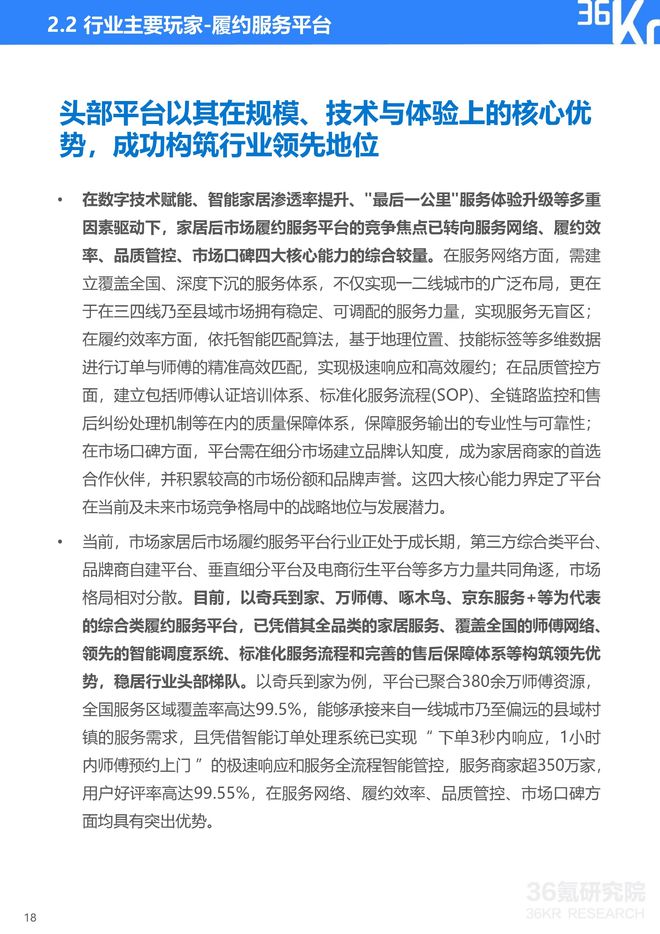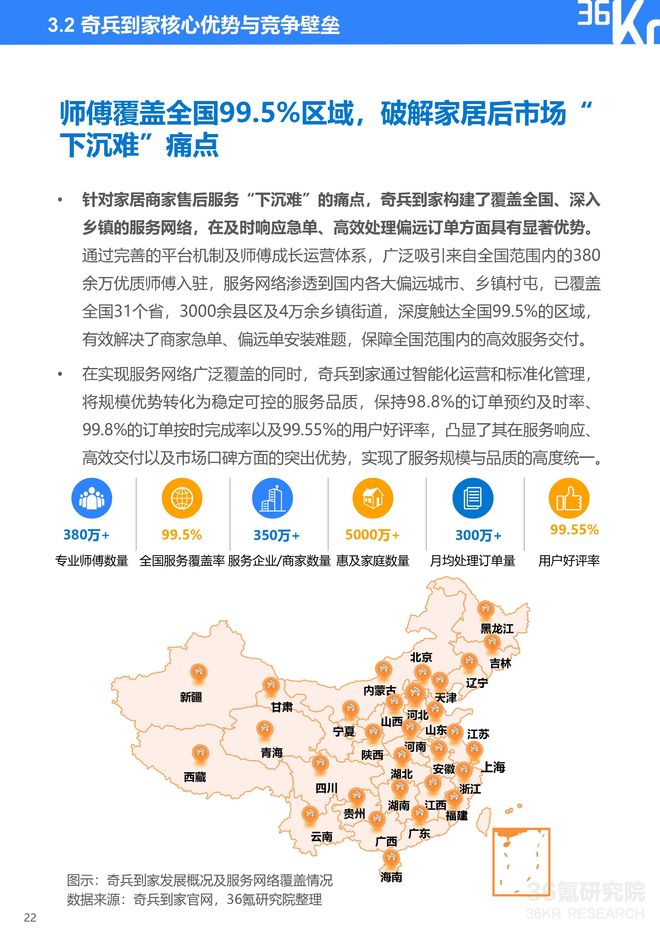 家居后市场行业生态主要玩家由蓝领师傅、履约服务平台、家居商家及消费者构成,其中履约服务平台是深度链接各方、整合调度资源的核心枢纽。随着数字技术的深度赋能、家居线上消费率稳步提升、"最后一公里"服务体验的持续升级,后市场履约服务平台的竞争焦点已转向服务网络、履约效率、品质管控、市场口碑四大核心能力的综合较量。以奇兵到家等为代表的综合类履约服务平台,凭借其全品类的家居服务、覆盖全国的师傅网络、领先的智能调度系统、标准化服务流程和完善的售后保障体系等构筑领先优势,稳居行业头部梯队。