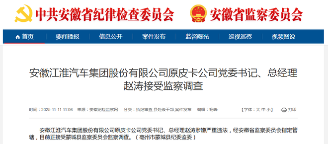 11月11日,据安徽纪检监察网通报,江淮汽车(600418)原皮卡公司党委书记、总经理赵涛因涉嫌严重违法,经安徽省监察委员会指定管辖,目前正接受安徽毫州市蒙城县监察委员会监察调查。