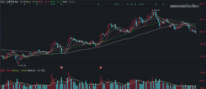 二级市场上,截至11月12日9点38分,江淮汽车开盘上涨0.13%报46.22元/股,总市值约1009.45亿元,今年来公司股价累计上涨超两成。