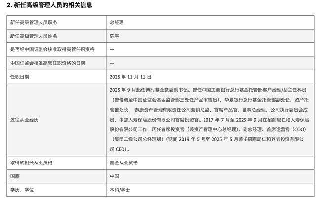 11月11日晚间,博时基金发布关于高级管理人员变更的公告。公告称,博时基金党委副书记陈宇接任公司总经理,任职日期为11月11日。