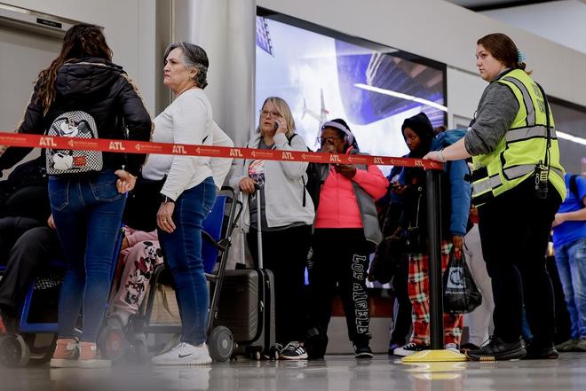 当地时间2025年11月10日,美国佐治亚州亚特兰大,哈兹菲尔德-杰克逊亚特兰大国际机场,乘坐边疆航空公司的旅客排长队重新预订被取消的航班。视觉中国 图