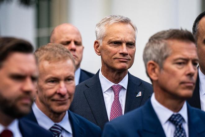 当地时间2025年10月30日,美国华盛顿,美国副总统JD·万斯(左起)、美国联合航空首席执行官斯科特·柯比、美国航空集团首席执行官罗伯特·伊索姆和美国交通部长肖恩·达菲在白宫外举行会谈。此次会谈的背景是政府停摆已近一个月,航空旅行因人手短缺而日益紧张。视觉中国 图