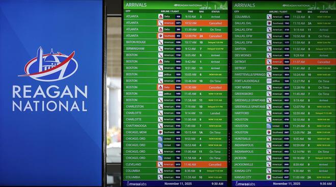 当地时间2025年11月11日,美国弗吉尼亚州阿灵顿,罗纳德·里根华盛顿国家机场的航班信息板显示航班取消。视觉中国 图
