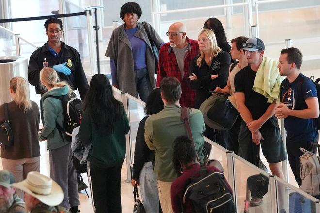 当地时间2025年11月11日,美国得克萨斯州,达拉斯爱田机场,美国运输安全管理局(TSA)工作人员引导旅客排队检查。视觉中国 图