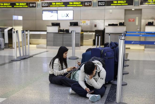 当地时间2025年11月10日,美国加利福尼亚州洛杉矶,洛杉矶国际机场,旅客们带着行李在值机柜台附近等待航班信息。视觉中国 图
